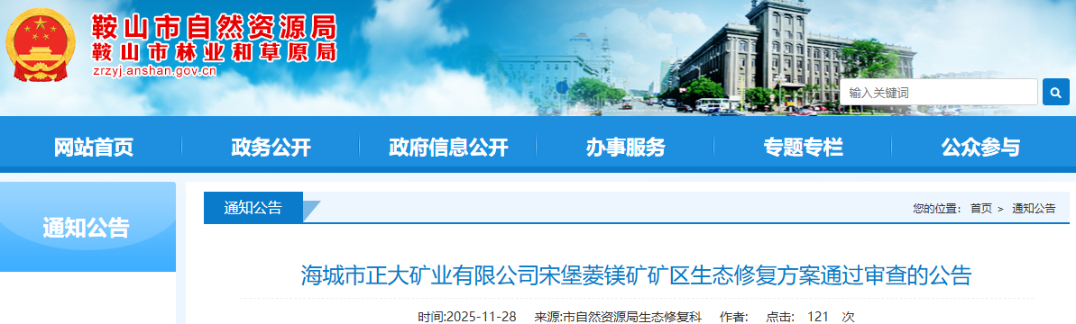 根據(jù)《遼寧省自然資源廳關(guān)于〈中華人民共和國礦產(chǎn)資源法〉實施衘接過渡期礦區(qū)生態(tài)修復(fù)方案評審工作的公告》、《遼寧省自然資源廳關(guān)于印發(fā)<礦山地質(zhì)環(huán)境保護與土地復(fù)墾方案省級審查管理辦法(試行)>的通知》(遼自然資發(fā)〔2022〕129號)有關(guān)要求,《海城市正大礦業(yè)有限公司宋堡菱鎂礦礦區(qū)生態(tài)修復(fù)方案》通過審查,現(xiàn)予公告。