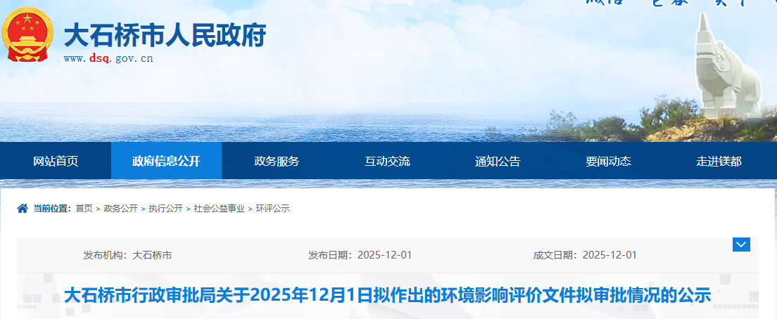 根據(jù)建設(shè)項(xiàng)目環(huán)境影響評(píng)價(jià)審批程序的有關(guān)規(guī)定,經(jīng)審查,我局?jǐn)M對(duì)1個(gè)項(xiàng)目環(huán)境影響評(píng)價(jià)文件作出審批意見(jiàn)。為保證此次審查工作的嚴(yán)肅性和公正性,現(xiàn)將擬作出審批意見(jiàn)的環(huán)境影響評(píng)價(jià)文件基本情況予以公示,公示期為2025年12月1日-2025年12月5日(5個(gè)工作日)。