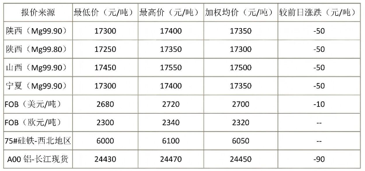 2. 原鎂報(bào)價(jià)為按照?qǐng)?bào)價(jià)企業(yè)產(chǎn)量加權(quán)計(jì)算后所得平均值,并按50元/噸取整;3. 表中價(jià)格均為現(xiàn)貨含稅、現(xiàn)金、不酸洗價(jià),國(guó)內(nèi)單位為元/噸;4. FOB為天津港離岸價(jià)格。