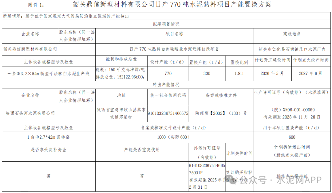 根據(jù)公示,韶關(guān)鼎信新型材料有限公司日產(chǎn)770噸熟料白色硅酸鹽水泥遷建技改項目置換產(chǎn)能330t/d,置換比例為1.8:1,計劃2026年5月開工,2027年6月點火投產(chǎn)。陜西石頭河水泥有限公司一條600t/d熟料線用于本項目置換產(chǎn)能,該生產(chǎn)線計劃新線點火投產(chǎn)前拆除退出。
